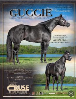 Guccie is a Black AQHA Reserve World Champion, BHF Reserve Champion, Top 5 AQHA World . His foals have acheived Appaloosa Reserve Champion, WCHA Reserve Champion, Futurity Championships and Reserve World Championships in 2 Breeding Seasons.